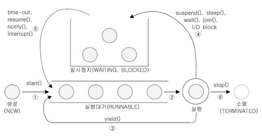 - 실행을 다 마치거나 stop()이 호출되면 쓰레드는 소멸