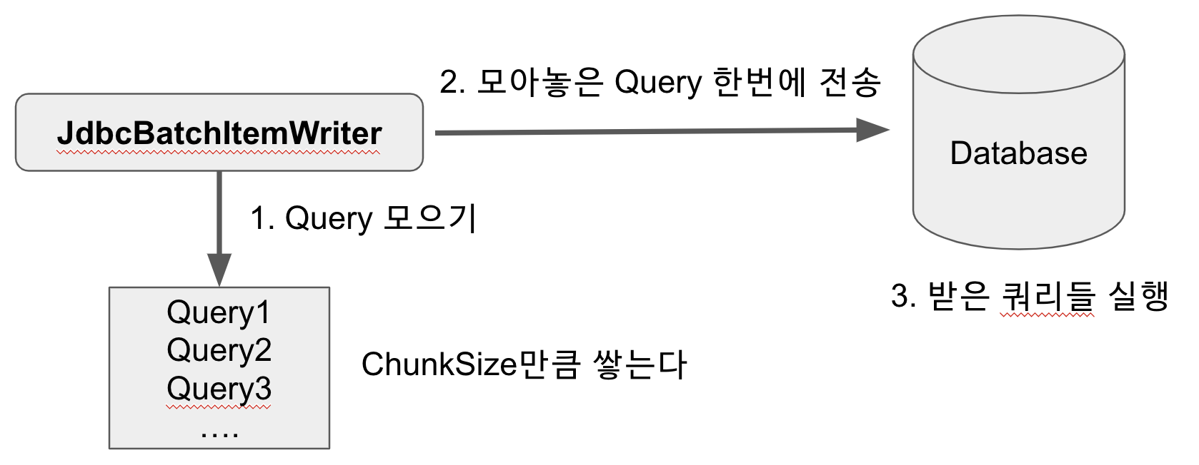 - Chunk 단위만큼 처리가 완료되면 Writer에 전달되어 Writer에 명시되어 있는대로 일괄 처리