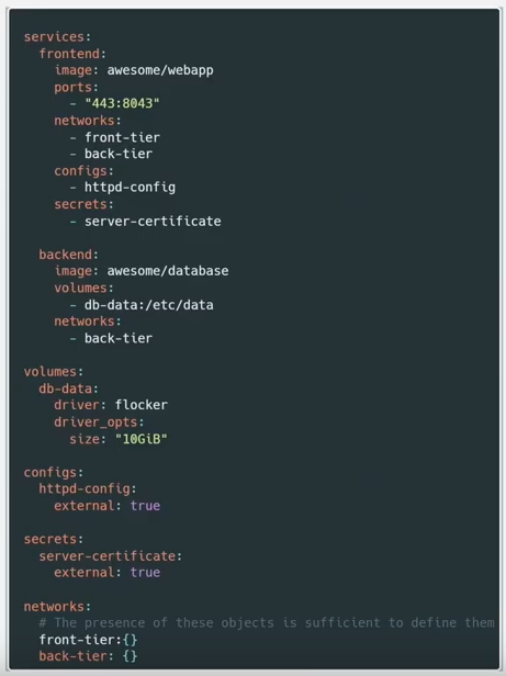 위 그림처럼 작성 시 'frontend'와 'backend'는 각 컨테이너의 이름이되고 컨테이너를 정의한다.