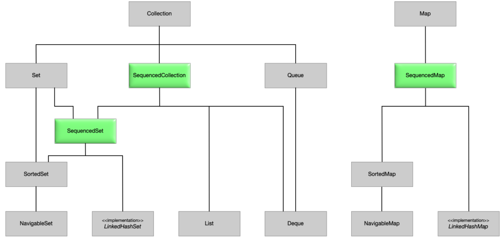 대중적이고 일반적으로 사용되는 모든 컬렉션 클래스는 이제 해당 컬렉션 유형에 따 java.util.SequencedCollection , java.util.SequencedSet 또는 java.util.SequencedMap 인터페이스도 구현한다.