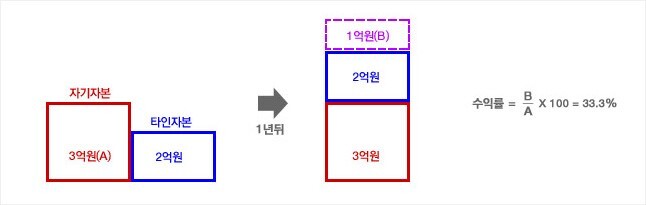만약 김씨가 5억 원을 전부 자기자본으로 마련해 1억 원을 벌었다면 수익률은 20%(1억/5억=20%)에 불과하다. 물론 여기에 5억 원을 모으기까지 걸리는 시간을 기회비용으로 더한다면 수익률 격차는 더욱 커질 수밖에 없다. 이처럼 개인이 빚을 지렛대 삼아 주식이나 부동산 등에서 수익률을 높이는 사례를 보고 레버리지 효과를 냈다고 한다.