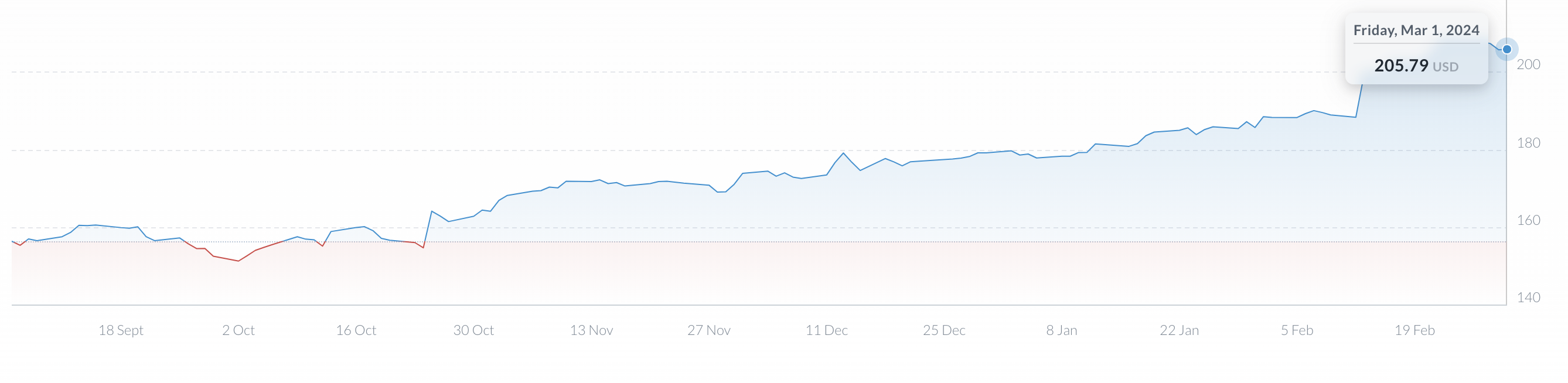차트를 통해 6개월 전보다 약 50$ 상승한 것을 알 수 있다.