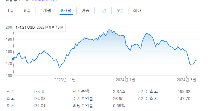 애플도 대표적으로 중국 매출 비중이 큰 기업인데, 거기에 AI에 대한 흐름을 못탔고, 전기차도 최근에 포기하고 뭔가 기대할만한 뉴스가 없어서 주가는 6개월 전과 비슷하다. 3, 4분기까지 기다리면 흐름타고 지금보다는 상황이 좋지 않을까 싶다.
