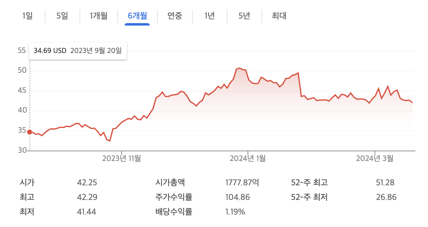 미국에서 인텔 파운드리를 밀어준다고 하는데, 그 효과가 나타나려면 시간이 얼마나 걸릴지...매출은 예측보다 2분기 연속 좋았다. 주가도 6개월 전보다는 상승한 상태이다. 앞으로도 상승할지는 인텔이라는 기업에 확신이 안선다.