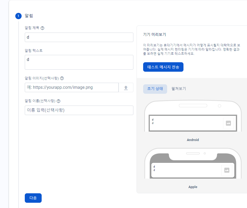 제목, 텍스트 입력 후 테스트 메시지 전송 클릭