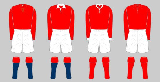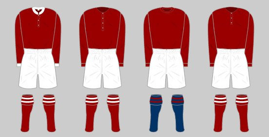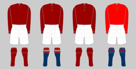 이 원조 유니폼은 어두운 빨간색으로, 긴 소매에 칼라가 있었고 앞쪽에 단추가 세 개 달려 있었다. 셔츠는 무릎까지 오는 흰색 반바지와 두꺼운 울 양말과 함께 착용되었다. 1910년까지는 골키퍼도 같은 유니폼을 입었으며, 이후에는 손으로 짠 크림색 울 폴로넥 스웨터로 바뀌게 된다.