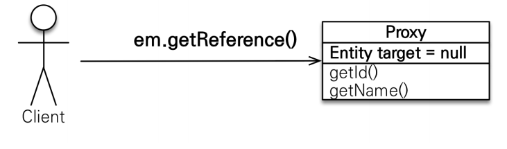 - em.getReference(): 데이터 조회를 미루는 가짜(프록시) 엔티티 객체 조회(DB로 쿼리를 날리지 않고 파라미터로 넣어준 클래스를 상속받은 가짜(프록시) 엔티티를 만들어서 프록시 객체가 영속성 컨텍스트에 들어간다.)