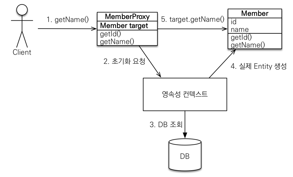 (5) 프록시 객체는 실제 엔티티 객체의 getName()을 호출해서 결과를 반환
