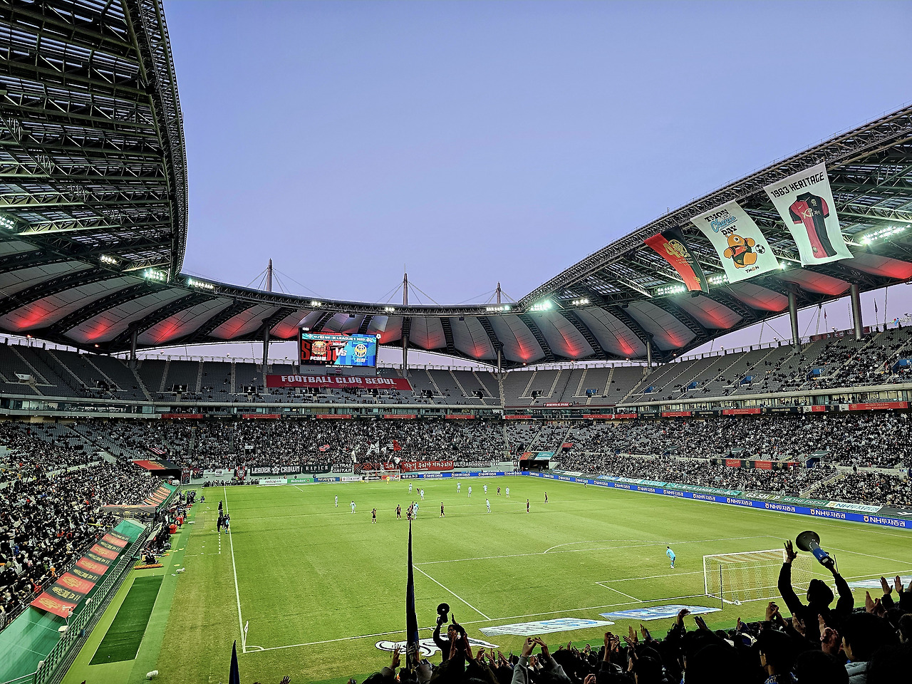 서울월드컵경기장 (상암월드컵경기장): 2002년 월드컵 개최지이자 FC 서울 홈구장. 경기장 내외부에 팀 대형 배너 및 붉은 조명 연출