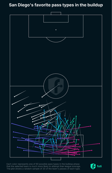 샌디에이고 FC는 “위험을 감수하더라도 빌드업 지향 축구”를 가장 중시한다. 경기당 평균 빌드업 터치가 무려 367회로, MLS에서 유례없는 수준이다.
