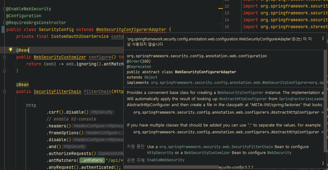 - 버전 5.7.0-M2 버전부터 변경되었고, SecurityFilterChain을 빈으로 등록해서 사용해야 한다.