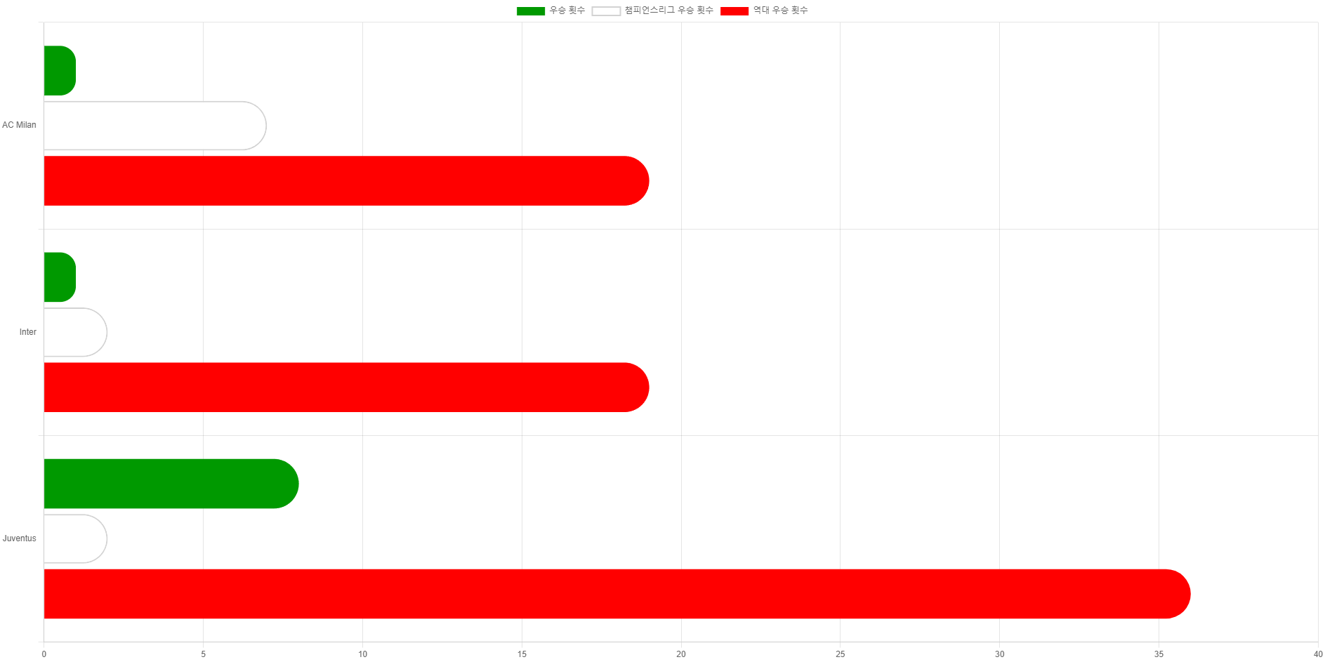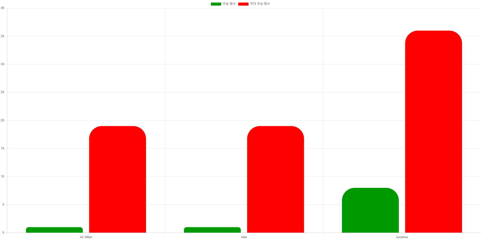 - 데이터는 10년 동안 이탈리아 프로 축구 리그 Seria A의 우승팀과 횟수이다.